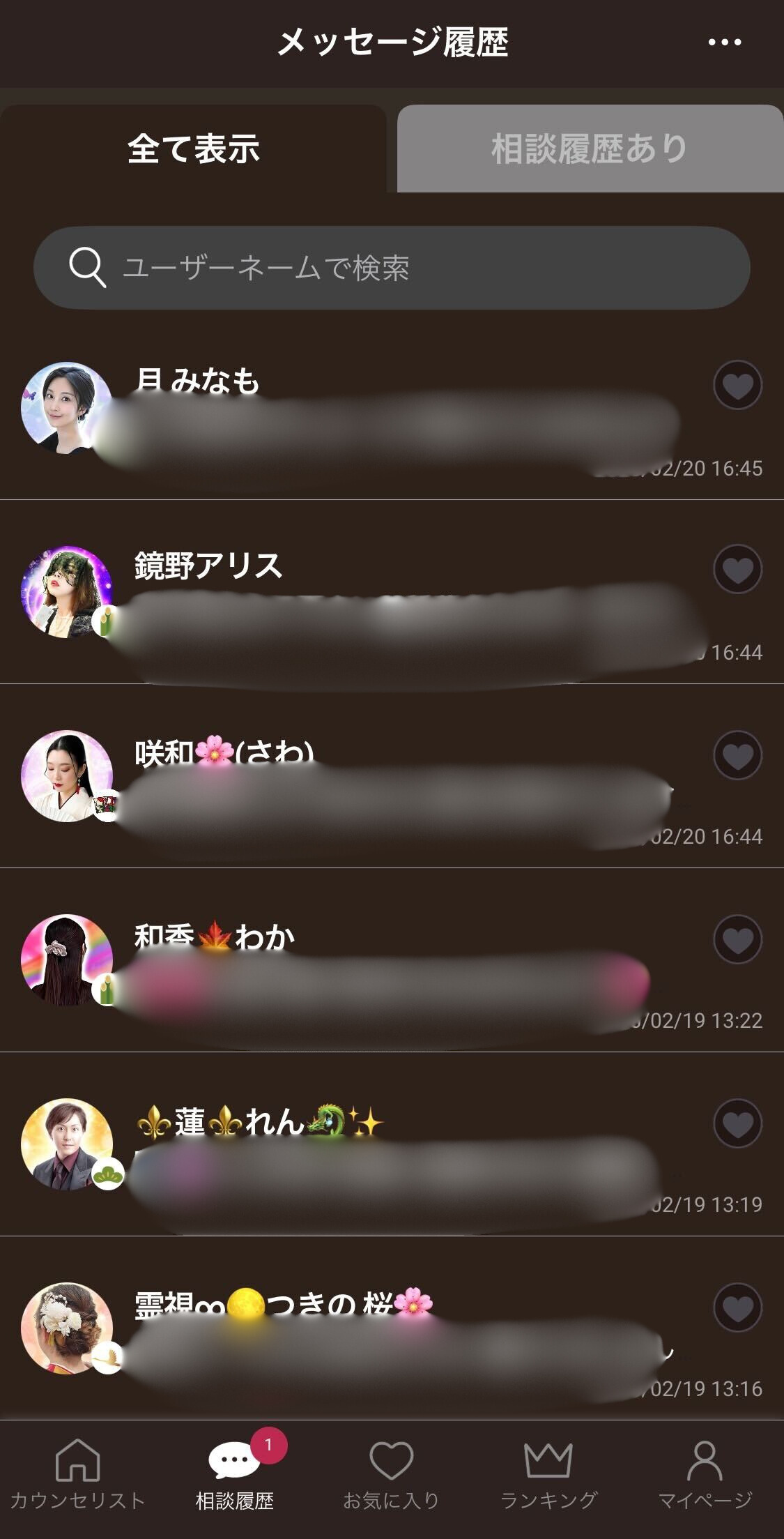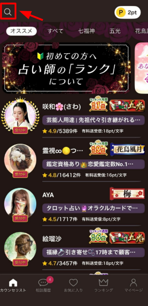 左上の「🔍」をタップしていただくと、占い師さんの検索も可能です💡