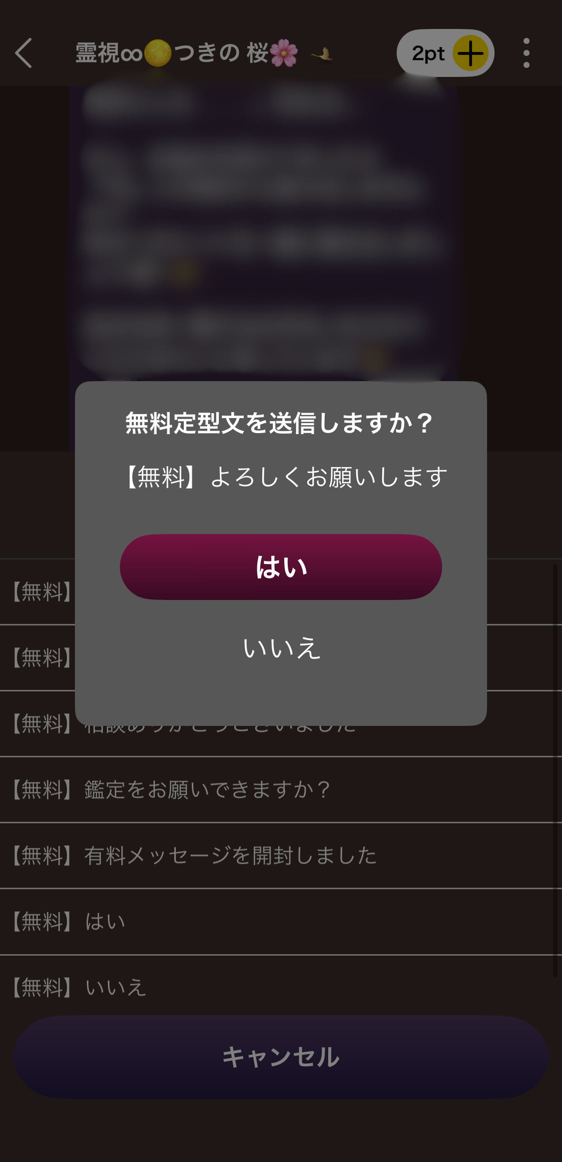 「はい」をタップしていただくと、占い師さんにテンプレートが送信されますのでご依頼完了です♪